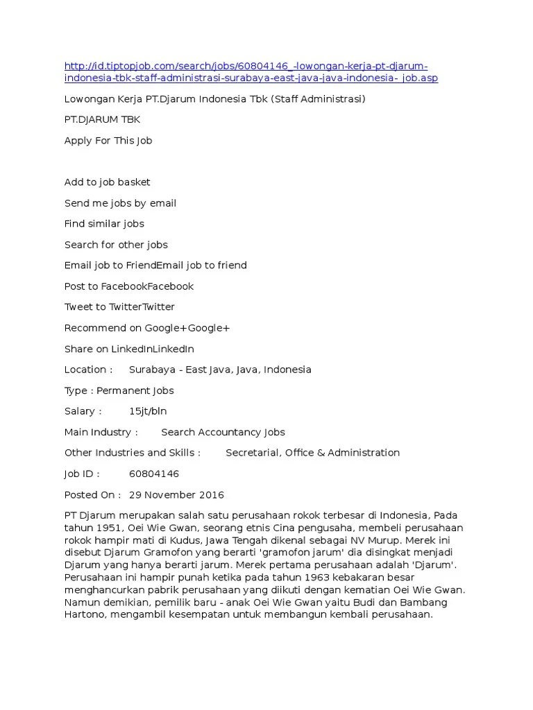 Melakukan observasi langsung dengan terjun ke lapangan atau ke wilayah maupun cabang yang… Mengenai posisi dan syarat lowongan kerja pt djarum terbaru (pt djarum) dapat anda lihat pada link rujukan dibawah ini situs loker ini menyediakan informasi kerja untuk seluruh wilayah yang ada di indonesia tanpa sekolah lulusan smp sma smk smu stm d1 d2 d3 d4 s1 s2. Pt djarum sudah berkembang denga cepat dari awalnya yg sederhana pada tahun 1950 an. Lowongan kerja tahun 2020 lowongan kerja sma smk d3 s1 loker terbaru semua jurusan lowongan bank lowongan bumn lowongan cpns pt djarum adalah sebuah perusahaan rokok terbesar yang bermarkas di kudus, jawa tengah, indonesia. Kami tidak bertanggung jawab atas penipuan lowongan pekerjaan yang mengatasnamakan pt djarum.