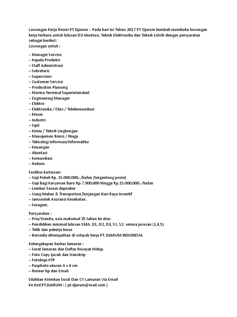 Bagi para pencari kerja yang berminat dengan lowongan kerja pt djarum 2019 dan merasa memenuhi seluruh kebutuhan yang dipersyaratkan perusahaan untuk dapat segera melengkapi berkas lamaran kerja meliputi surat lamaran kerja. Banyak lowongan kerja parepare, sebanyak 14 loker parepare by lowongan kerja 15. Pt djarum adalah sebuah perusahaan rokok yang berpusat di kudus, jawa tengah. Parepare & sekitar pangkep pinrang sidrap barru palopo promote loker, event, produk, bisnis dll via dm ya. Melakukan observasi langsung dengan terjun ke lapangan atau ke wilayah maupun cabang yang…